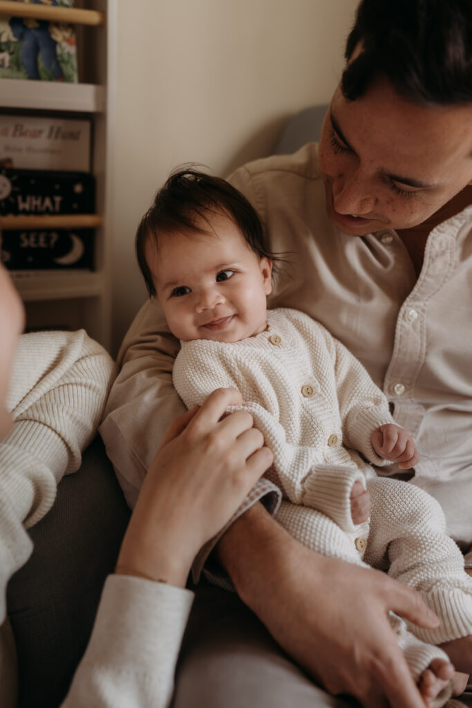 I can’t even begin to explain to you how much I love being able to capture babies at 4 months – 6 months old. Their personalities as they start to blossom into little people. Those cheeky gummy smiles, those huge baby rolls from what she felt like endless months of feeding. Watching them explore their hands and feet and for me to be able to photograph this. Seeing and photographing the joy on your faces as your baby begins to reward your hard work and sleepless nights with those sweet interactions. They make it so worthwhile. Baby’s first sounds, when they start rolling over and of course the ultimate… baby giggles! There is nothing else like it.