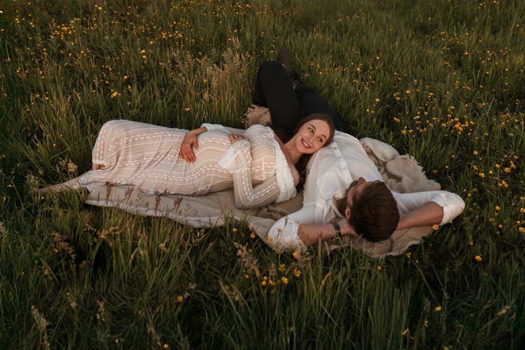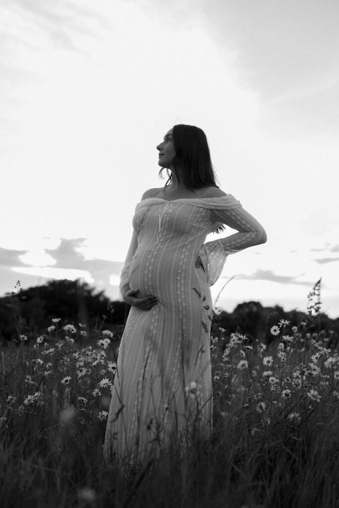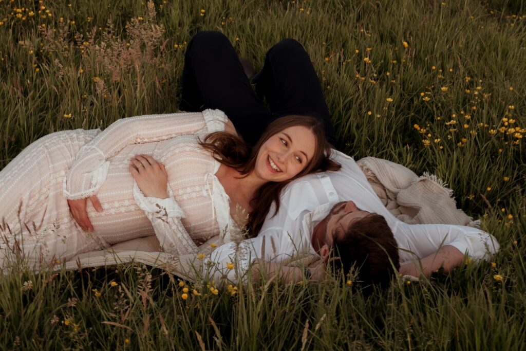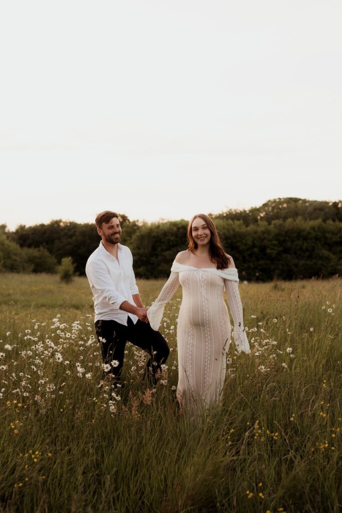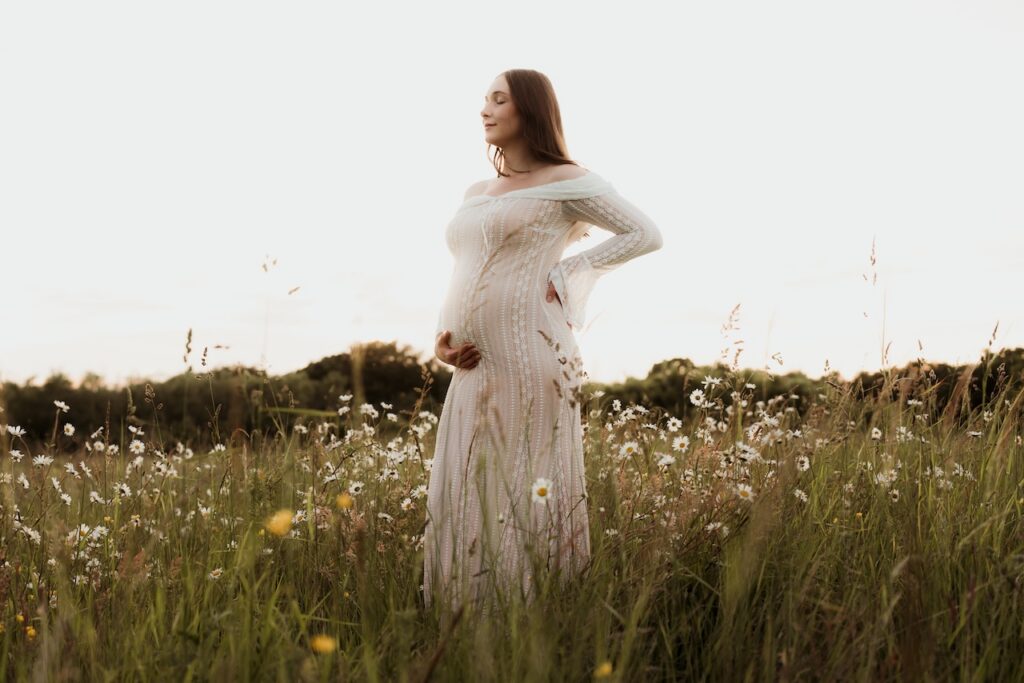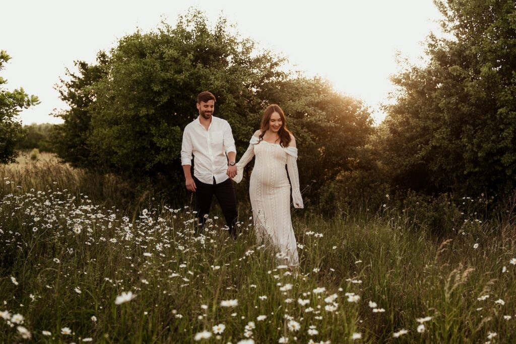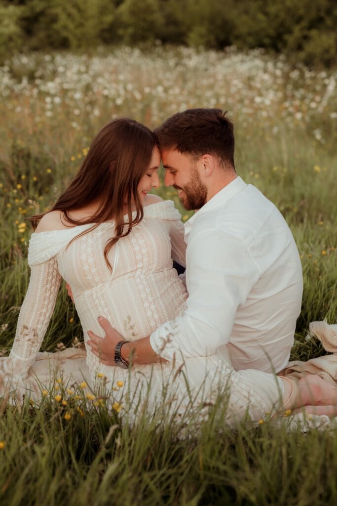 The light during this session was soft and golden, wrapping the meadow in warmth as the evening settled. That kind of light adds a sense of calm and intimacy, perfectly suited to maternity photography.