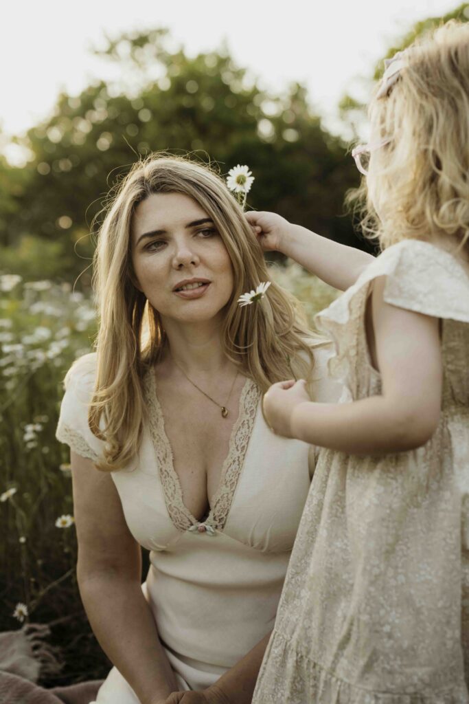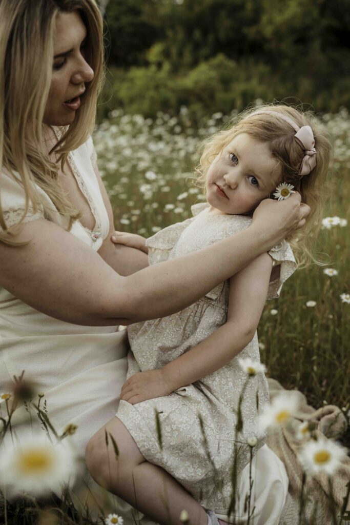 This mother and daughter had previously booked family sessions with me, and it felt really special to welcome them back for something more focused and intentional. Together, we chose the very best evening for wildflowers, and were rewarded with an incredible meadow filled with daisies, warm air, and a soft, glowing sunset.
